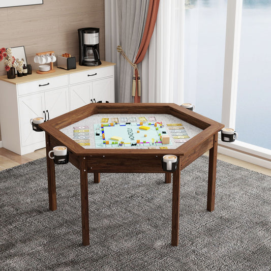 Hexagon 2 in 1 Dual Functional Table for 6, Gaming and/or Dining Table w/Rotating Cup Holders, Board Game Table w/Removable Tabletop, w/Solid Wood Legs, Non-Slip Play Mat-Rustic Brown