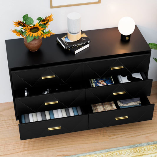 Modern 6 Drawer Dresser, Storage Cabinet w/Golden Handles-Black or White
