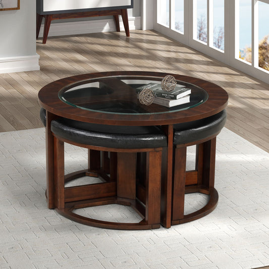 Solid Wood Glass Top Round Coffee Table Set w/4 Stools-Espresso